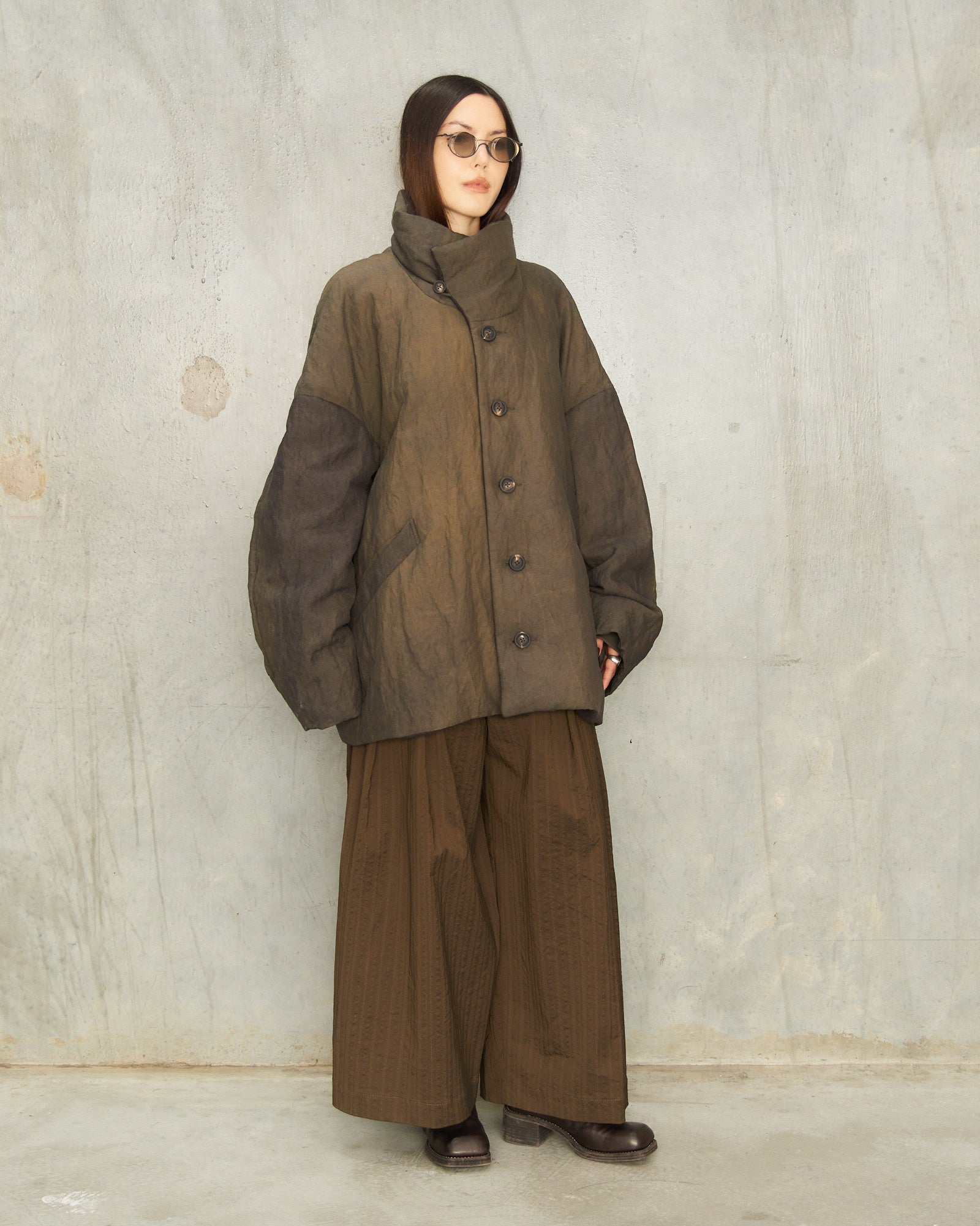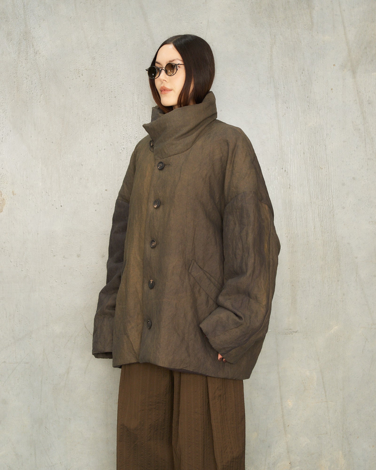 Dyed duvet down jacket by Ziggy Chen. Oversized, slouched puffer jacket filled with goose down for weightless warmth. Naturally dyed acetate-cotton blend reveals a subtle gradient, while interwoven metallic fibres lend a gentle, shifting iridescence.