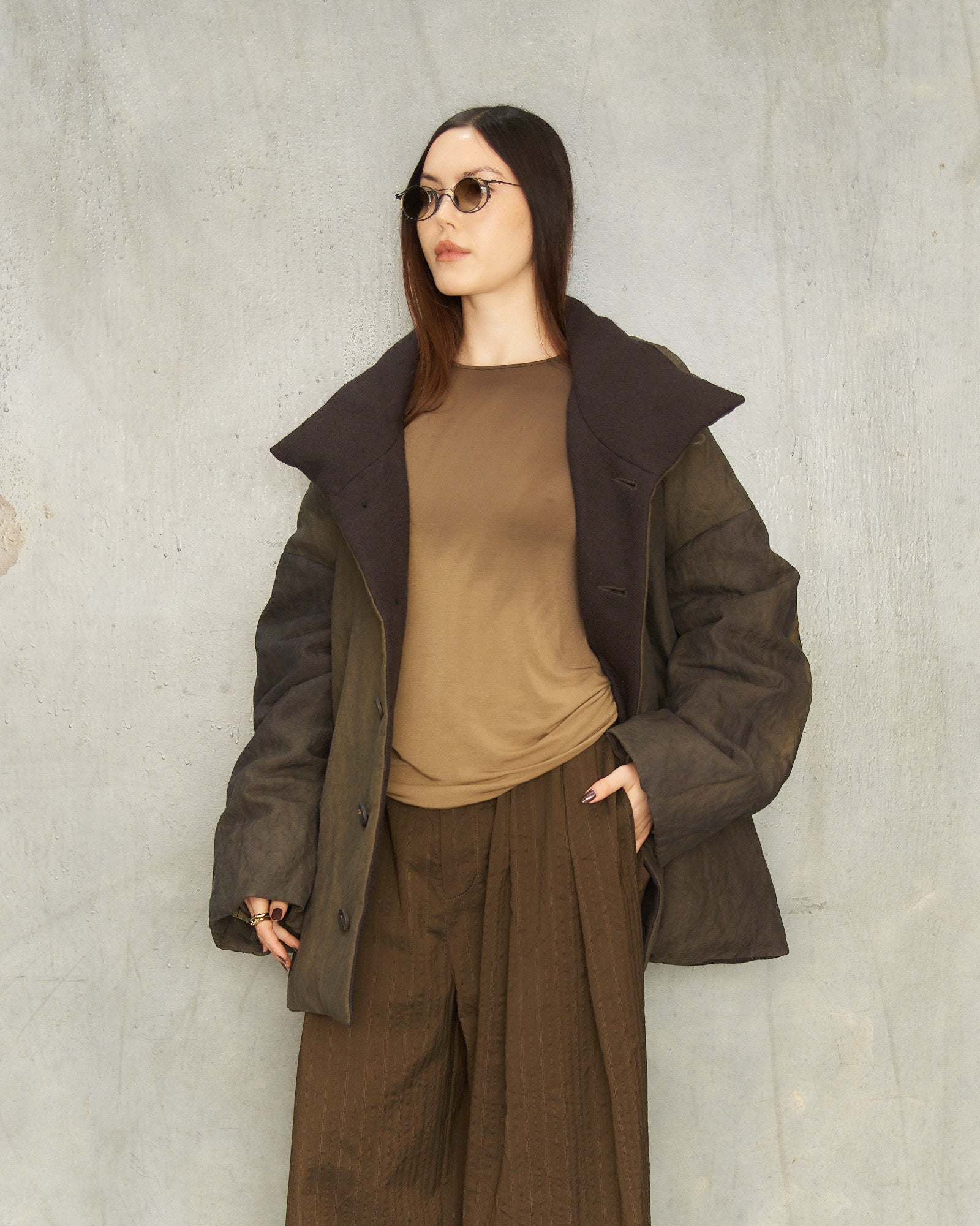 Born and based in Shanghai, Ziggy Chen fuses Chinese history and classical aesthetics with contemporary Western tailoring. His garments embody a refined, timeworn elegance, defined by artisanal techniques, muted tones and deconstructed silhouettes.