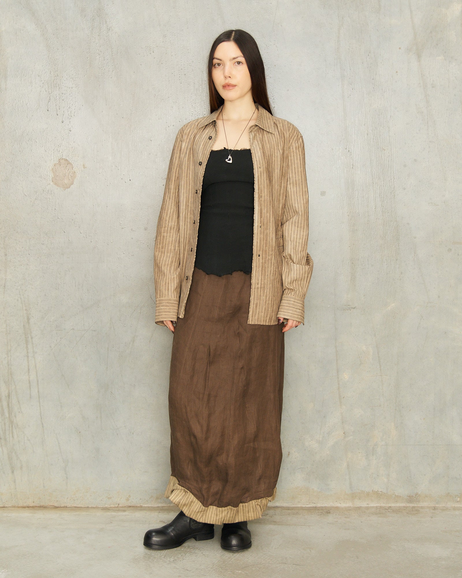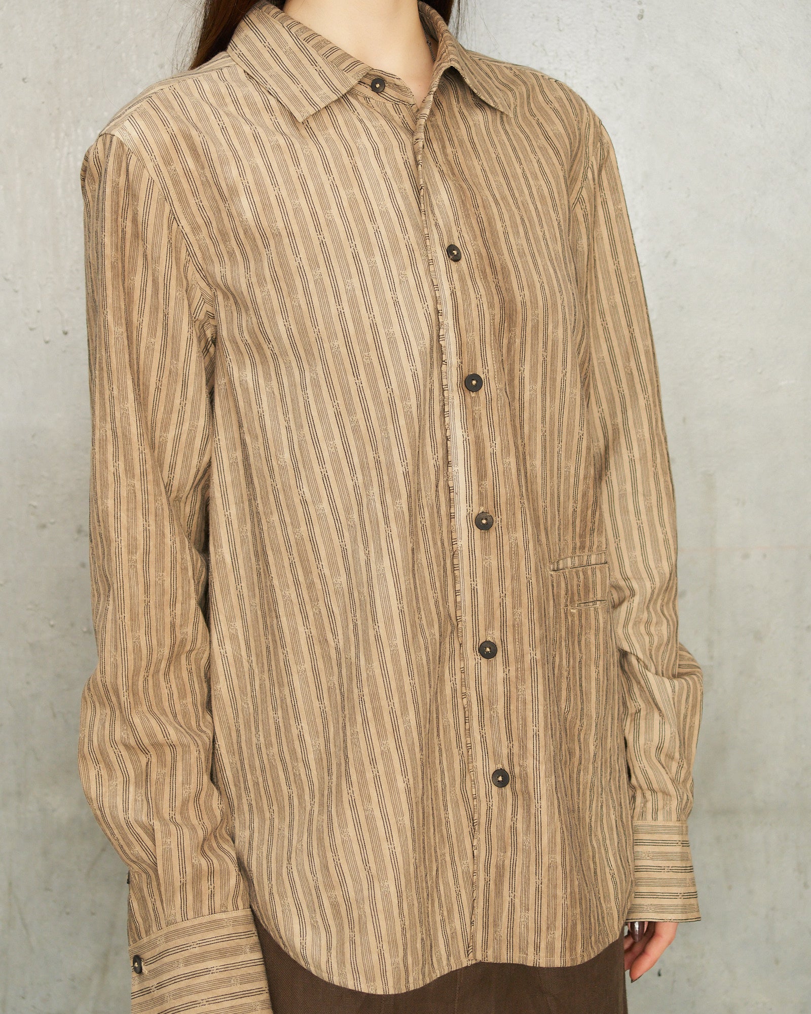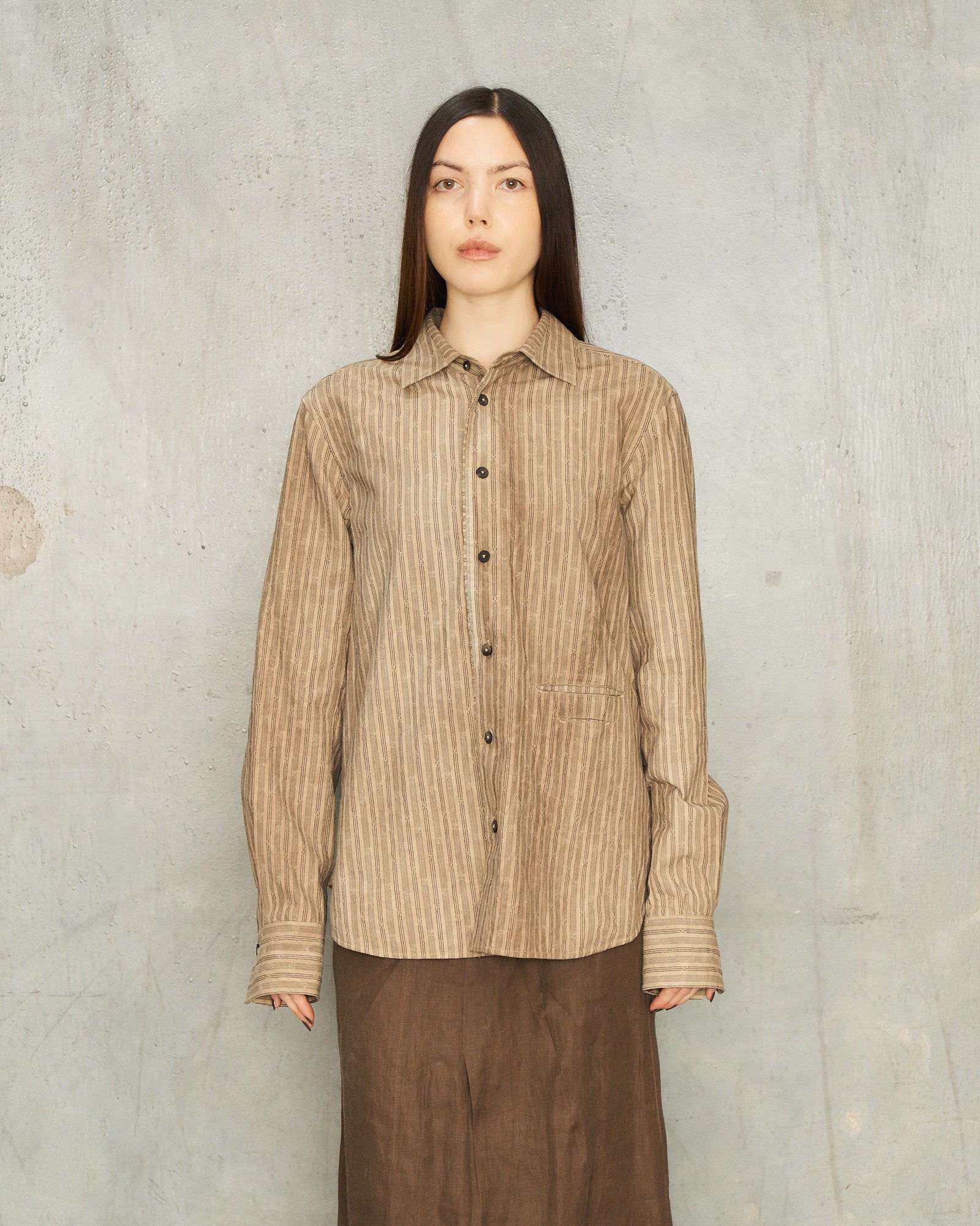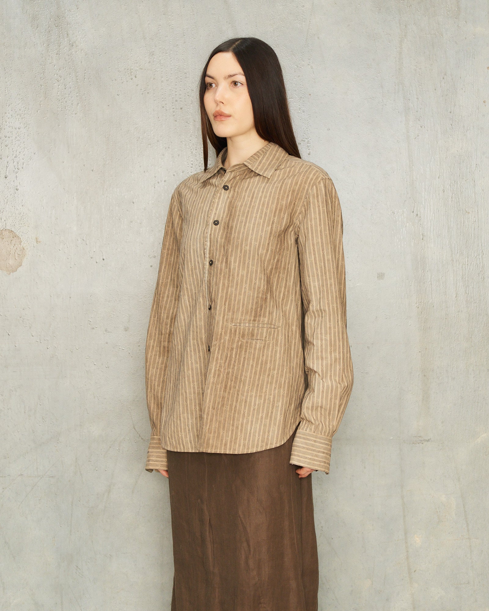 Stripe collared shirt by Ziggy Chen in natural. Buttoned shirt crafted from softly washed cotton, naturally dyed in a serene, earthy tone. Subtle striped texture enhances the timeworn, nostalgic character, while small slip pockets at the waist finish the piece with signature refinement.
